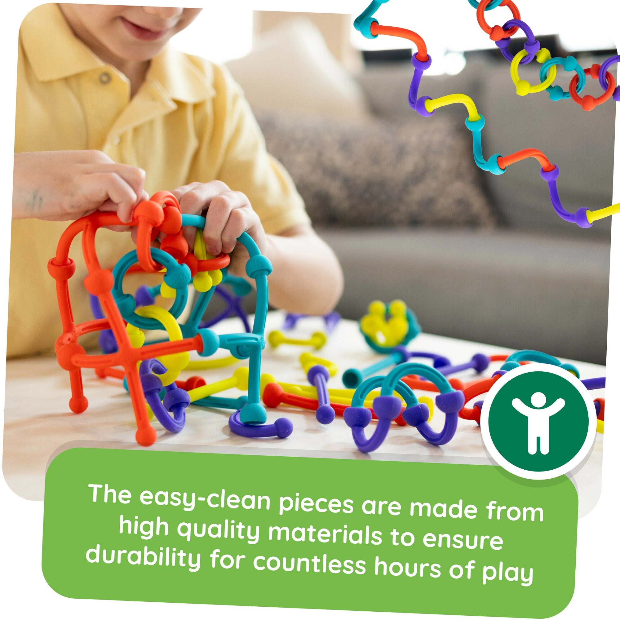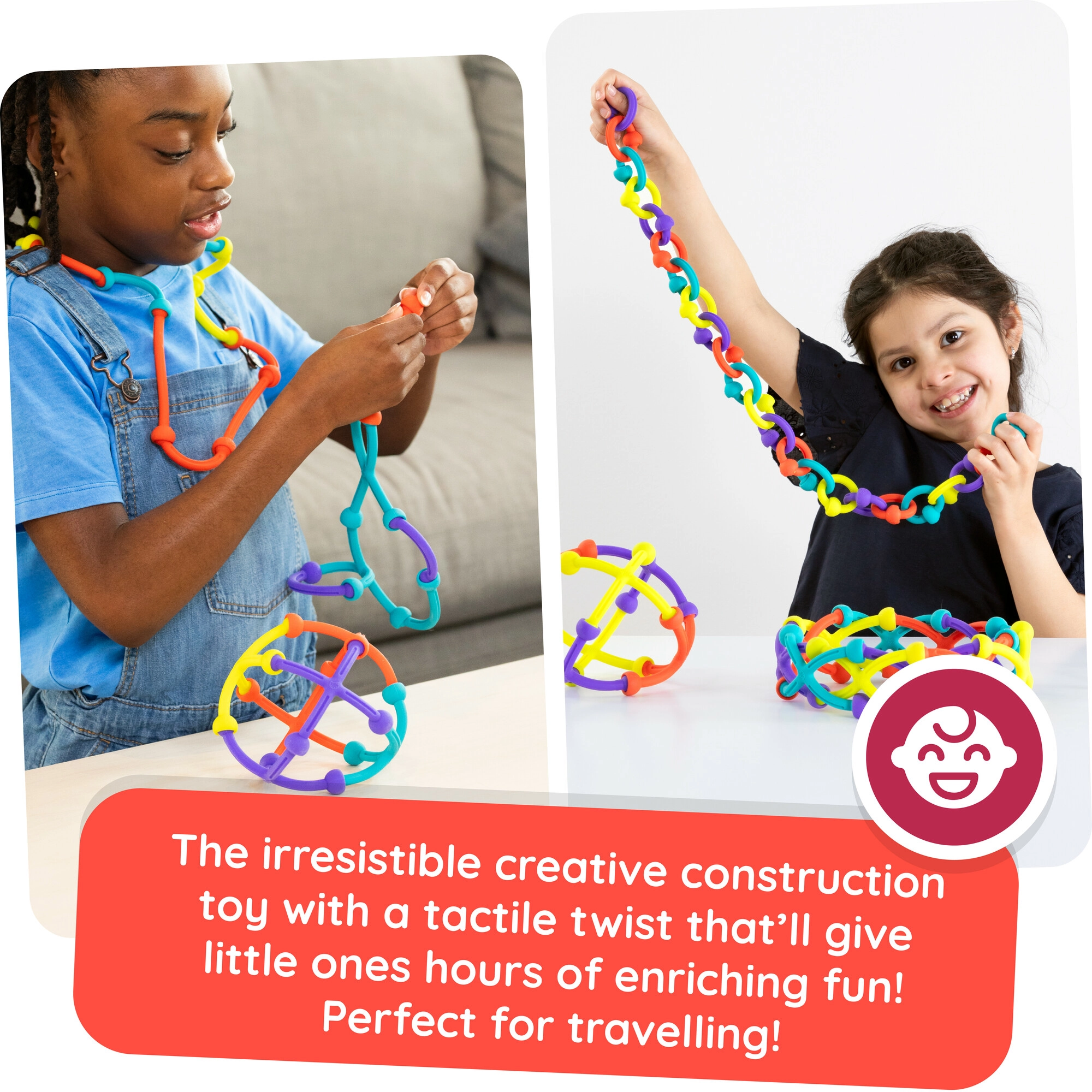Beliebte Ikonen: Dimpl und Simpl Dimpl für Haptik und Farben, Whirly Squigz und Squigz mit Saugnäpfen für Bauen und Kreativität, Tobbles und SpinAgain für Gleichgewicht und Koordination, InnyBin für Stecken und räumliches Denken. Diese didaktischen und edukativen Spielzeuge für Babys, Kleinkinder und Vorschulkinder sind intuitiv, unterhaltsam und originell und fördern STEM-Fähigkeiten, Fantasie und Geduld.
