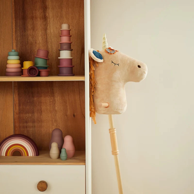 Das beliebte Steckenpferd (Hobby Horse, Plüsch-Steckenpferd) unterstützt die Entwicklung der Grobmotorik, Gleichgewicht und Koordination und fördert zugleich Fantasie sowie soziale Fähigkeiten. Dank der Aktivität Hobby Horsing bewegen sich Kinder ganz natürlich drinnen wie draußen, trainieren Parcours, Rennen und Ausdauer und genießen aktive Bewegung.