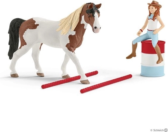Das Western-Reitset Hannah bringt die Atmosphäre von Barrel-Racing-Wettbewerben ins Kinderzimmer. Das Set bietet bunte Fässer und niedrige Hindernisse, die frei platziert werden können – so erstellt das Kind ganz einfach seine eigene Reitstrecke. Dank abnehmbarem Sattel und Zaumzeug kann Hannah das Pferd für Training und Wettkampf vorbereiten.