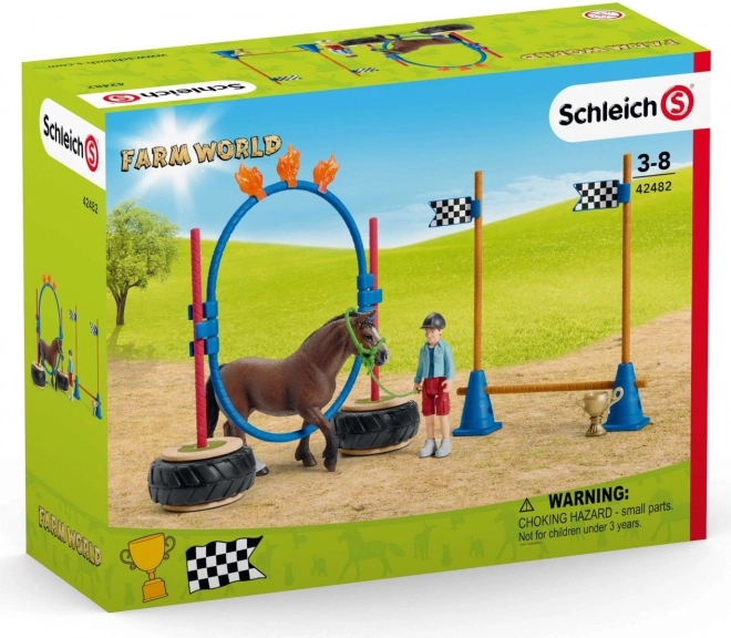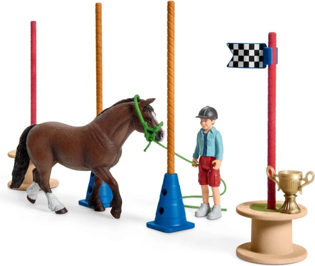 Bereiten Sie Ihr walisisches Pony auf das Agility-Rennen vor und finden Sie heraus, ob es alle Hindernisse souverän überwinden kann. Dieses Set enthält alles, was Sie für ein realistisches Trainingserlebnis benötigen, inklusive einer Jungenfigur, Reithelm und Hindernissen mit Start-Ziel-Flaggen. Details sind typisch für Schleich und nähern sich dem Landleben an.