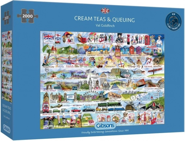 Entdecken Sie den Zauber britischer Tradition mit einem hochwertigen Puzzle von GIBSONS. Dieses detailreiche Puzzle mit dem Motiv Cream Tea bietet 2000 Teile und hat im fertigen Zustand eine Größe von ca. 98 × 68 cm. Eine hervorragende Wahl für Teeliebhaber, England-Fans und anspruchsvolle Puzzler.