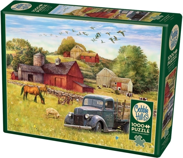 Das Puzzle zeigt eine bezaubernde Szene eines Bauernhofs mit einer roten Scheune, einem alten Lastwagen und Tieren, die auf der Weide grasen.