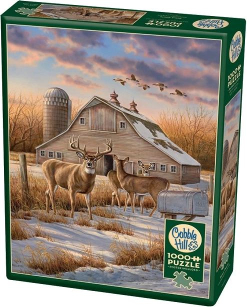 Entdecken Sie den Zauber einer winterlichen Landschaft mit Hirschen, einer Scheune und fliegenden Gänsen – die detailreiche Illustration ergibt ein eindrucksvolles Motiv, das Natur- und Landlebensliebhaber begeistern wird. COBBLE HILL Puzzles sind bekannt für ihre präzise Qualität und die einzigartige Stanzung, die ein unverwechselbares Puzzle-Erlebnis bietet.