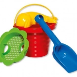 Eimer, Schaufel, Form und Sieb – die ideale Kombination für den Bau von Sandburgen und Spiele am Wasser.