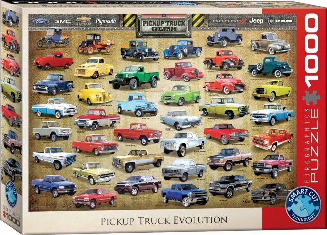 Genießen Sie das Premium-Puzzle von EUROGRAPHICS mit einem attraktiven Motiv aus der Automobilgeschichte und der Entwicklung der Pick-ups. Dank des ungewöhnlichen Stanzschnitts, der kein klassisches Raster kopiert, sind Ecken und Kanten der Teile vielfältig, und jedes Verbinden ist eine echte Herausforderung. Die ideale Wahl für erfahrenere Puzzleliebhaber oder als originelles Geschenk.