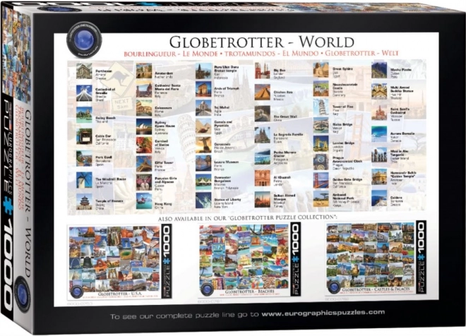 Begeben Sie sich mit dem EUROGRAPHICS-Puzzle Globetrotter auf eine faszinierende Reise rund um die Welt. Jedes Teil fügt sich in eine sorgfältig gestaltete Illustration voller berühmter Sehenswürdigkeiten und Reiseziele. Auf der Rückseite der Schachtel finden Sie auf Englisch ausführliche Beschreibungen von über 40 der bekanntesten Orte – so ist Puzzeln nicht nur Spaß, sondern auch Lernen.