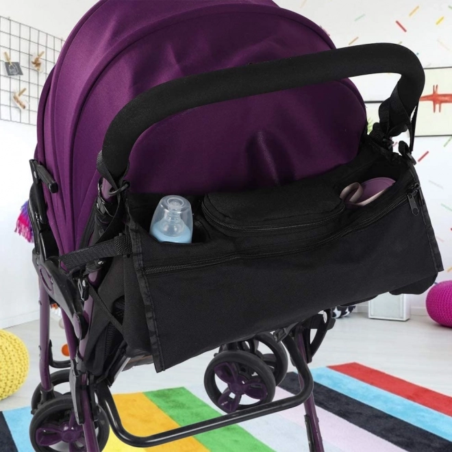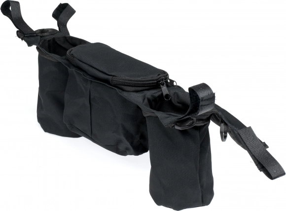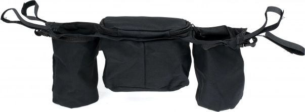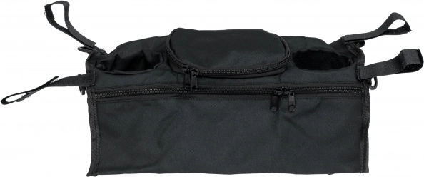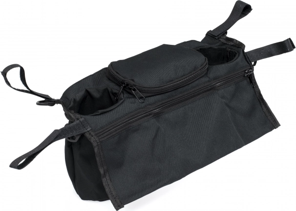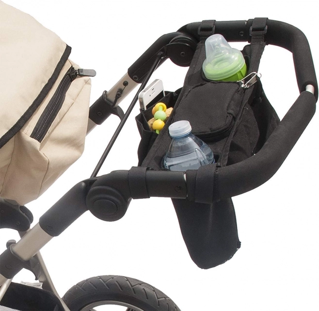 Praktischer Kinderwagen-Organizer mit mehreren Fächern hält alles Wichtige griffbereit. Er verfügt über 2 offene Flaschenhalter, zwei Reißverschlussfächer und eine einfache Befestigung am Griff mittels Klettbändern.