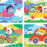 Dieses Set enthält vier separate Puzzles mit den Maßen 24 x 16 cm und unterschiedlicher Teileanzahl (von 5 bis 8), die die Puzzlefähigkeiten des Kindes schrittweise verbessern und den Schwierigkeitsgrad erhöhen. Jedes Puzzle ermöglicht das separate Herausnehmen und Zusammenlegen eines kompletten Verkehrsmittels, was die Entwicklung der Motorik und des logischen Denkens bei Kindern fördert.