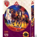 Die Montage ist einfach: Nach dem Verkleben des Puzzles auf die beiliegende Unterlage setzen Sie den Rahmen zusammen, legen das Motiv ein, befestigen die Clips und setzen das Uhrwerk auf. Das Ergebnis ist eine dekorative Uhr mit einem Durchmesser von ca. 46 cm, die Pferdeliebhaber und Puzzle-Fans gleichermaßen begeistert.