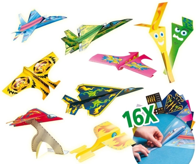 Kreativset für die Herstellung von bis zu 16 Papierflugzeugen mit Aufklebern. Einfaches Falten, großer Spaß und Förderung der Kreativität für Kinder ab 6 Jahren.