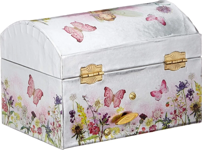 Elegantes Musik-Schmuckkästchen von GOKI im Design einer blühenden Wiese begeistert alle Liebhaberinnen von Schmuck und kleinen Kostbarkeiten. Beim Öffnen beginnt die Ballerina vor dem Spiegelchen zu tanzen und die zarte Melodie Schwanensee erklingt. Silberner Glanz, Blumen- und Schmetterlingsmotive und sicheres Verschließen machen es zu einer schönen Dekoration und einem praktischen Helfer.