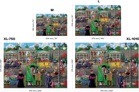 Dieses Holzpuzzle zeigt ein attraktives Motiv einer belebten historischen Straße und bietet dank der beidseitigen Ausführung eine doppelte Portion Spaß – auf der Vorderseite puzzeln Sie nach dem Bild, auf der Rückseite nach dem wiederkehrenden Muster und den Formen. Laserbetonte Details und speziell geformte Teile in Form von Tieren, Bauwerken und Gegenständen verleihen dem Puzzeln eine neue Dimension.