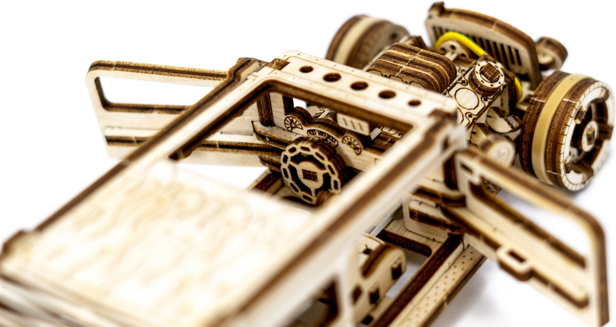 Durch die Dachöffnung sehen Sie einen detailreichen Motor, einen Doppelsitz sowie einen Schalthebel. Dank der durchdachten Mechanik macht das Modell beim Bauen, Spielen und Ausstellen gleichermaßen Spaß. Gefertigt aus umweltfreundlichem Birken-Sperrholz, im Lieferumfang ist eine bebilderte Anleitung enthalten. Schwierigkeitsgrad 3/5, ungefähre Bauzeit ca. 2 Stunden.