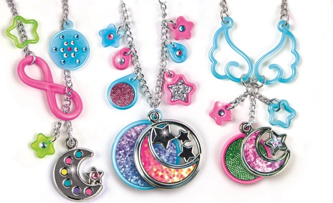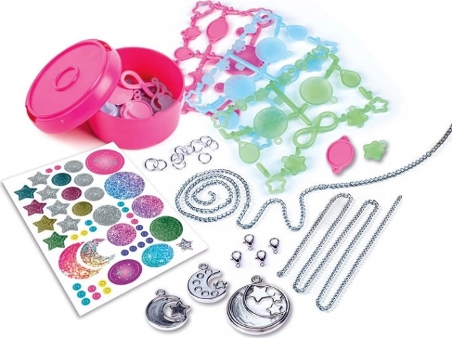 Exklusives Set zur Herstellung von Armbändern und Halsketten mit fantastischen Anhängern Crazy Stars und Crazy Moon, die IM DUNKELN LEUCHTEN! Entdecke verschiedene Kombinationen, um Schmuck mit funkelndem Effekt zu gestalten! Das Set enthält: bunte Kunststoffanhänger in Mond- und Sternform, im Dunkeln leuchtende Anhänger, Anhänger mit Silbereffekt, Metallketten, Haken und Metallringe, Aufkleber mit Glitzer, Zubehörkästchen, bebilderte Anleitung mit ergänzenden Texten auf Tschechisch.