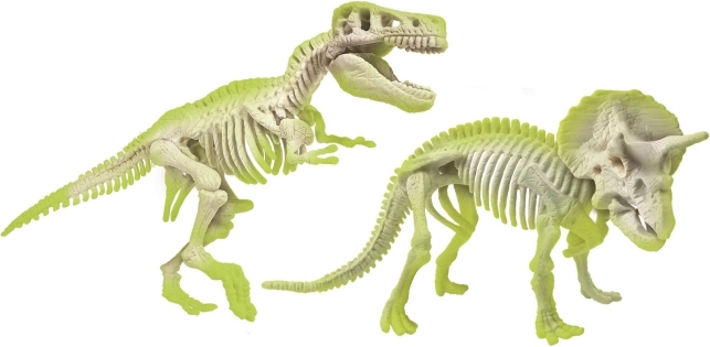 Fluoreszierende Skelettteile absorbieren Tageslicht und strahlen im Dunkeln. Die fertigen Modelle von T‑Rex und Triceratops sind eindrucksvolle Deko und zugleich Lernmaterial.