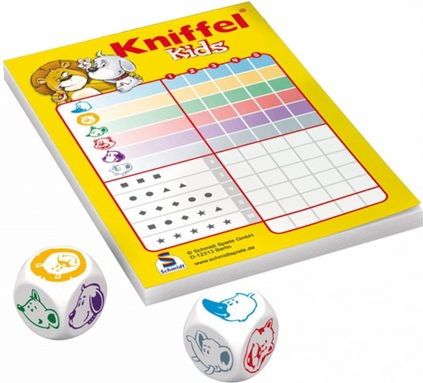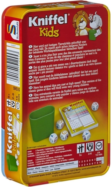 Kniffel Kids ist die beliebte Familienvariante für Kinder, die Beobachtungsgabe, Logik und einfaches Rechnen fördert. Die Spieler würfeln mit Tierwürfeln, versuchen die vorteilhaftesten Kombinationen zu bilden und notieren die Ergebnisse im beiliegenden Block. Dank der robusten Blechdose ist das Spiel perfekt für Ausflüge, den Urlaub oder das Restaurant.