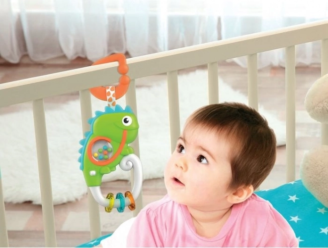 Das interaktive Rasselspielzeug Fröhliches Chamäleon ist der ideale Begleiter für die Kleinsten. Dank des praktischen Rings und der Schlaufe lässt es sich leicht am Kinderbett, Kinderwagen oder Autositz befestigen. Das Kind wird von Melodien und Soundeffekten angezogen, während rasselnde Kügelchen und Ringe die visuelle und auditive Wahrnehmung sowie die Handkoordination fördern.