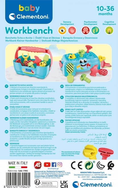 Die kleine Werkbank CLEMENTONI BABY Play for Future ist das ideale Spielzeug für neugierige Kinder, die gerne schrauben, hämmern und die Welt der Werkzeuge entdecken. Die Werkbank lässt sich im Handumdrehen in eine praktische Kiste mit bequemem Griff verwandeln, sodass alle Teile leicht verstaut und überallhin mitgenommen werden können.