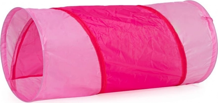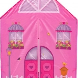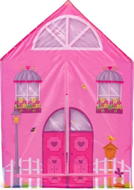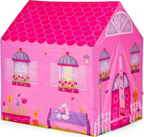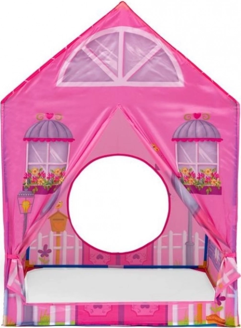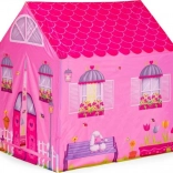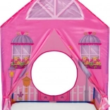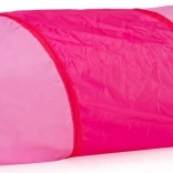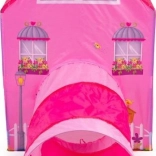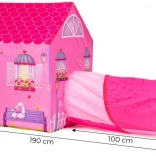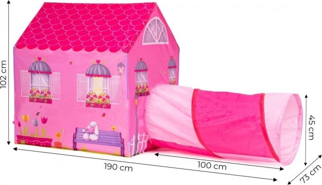 Kinderzelt mit Tunnel im Motiv eines rosafarbenen Häuschens.