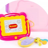 Zeichentafel mit Stift, Zahnräder, Tasten, Spiegel sowie Schlüssel mit Fernbedienung fördern die Feinmotorik sowie Seh- und Hörsinn.