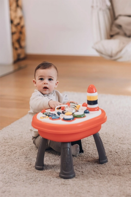 Unterhaltsamer interaktiver Tisch für die Kleinsten, der die sensorische Wahrnehmung, Feinmotorik und Kreativität fördert. Bietet Licht- und Klangeffekte, eine zweistufige Lautstärkeregelung, ein drehbares Panel mit einer Seite für Lego-ähnliche Bausteine sowie viele Tasten, Zahnräder und Spielelemente. Das Panel ist herausnehmbar, der Tisch kann auch als Aufbewahrungsbox für Spielzeug dienen.