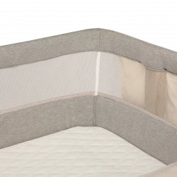 Die höhenverstellbare Liege in 5 Stufen ermöglicht eine präzise Ausrichtung am Bett, und die Option der Matratzenneigung erhöht den Komfort bei Schnupfen oder Reflux. Das atmungsaktive Netz verbessert die Belüftung und die Sicht auf das Kind. Die stabile Konstruktion wurde von TÜV SÜD und SGS gemäß den Normen EN 1130 und EN 16890 geprüft.