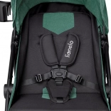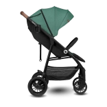 Für Sicherheit sorgen 5-Punkt-Gurte und ein abnehmbarer Bügel, der den Bereich für das Kind definiert und das Einsteigen erleichtert. Stufenlose Verstellung der Rückenlehne bis in die Liegeposition und eine verstellbare Fußstütze gewährleisten eine ergonomische Haltung. Große EVA-Räder mit vollständiger Federung dämpfen Unebenheiten, die schwenkbaren Vorderräder (360°) lassen sich für Geradeausfahrt arretieren und die zentrale Bremse sorgt für sicheres Anhalten.