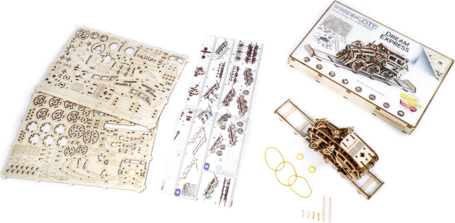 Der Traum-Express ist mit Antriebsrädern ausgestattet und ermöglicht Vorwärts-, Rückwärts- und Rundfahrtbewegungen. Bei vollständig aufgezogenem Gummimotor erreicht er eine Strecke von bis zu 3 Metern. Eine großartige Möglichkeit, Kindern und Erwachsenen die Prinzipien der Mechanik und die Fingerfertigkeit beim Zusammenbauen näherzubringen. Im Lieferumfang ist eine bebilderte Anleitung enthalten, die den Aufbau erleichtert.