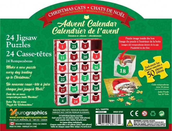 Verkürzen Sie die Wartezeit bis Heiligabend mit einem originellen Adventskalender der Marke EUROGRAPHICS. Im Inneren finden Sie 24 einzelne Mini-Puzzles mit einem niedlichen Motiv von Weihnachtskatzen, jeweils mit 50 Teilen. Der Kalender verfügt über wiederverwendbare Schublädchen, sodass Sie ihn nach den Feiertagen ganz einfach mit kleinen Überraschungen befüllen und auch im nächsten Jahr nutzen können.