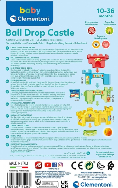 Bauen Sie eine farbenfrohe Burg und beobachten Sie, wie der Ball die Strecke durch die Türme und entlang der Mauern hinabrollt. Mit dem Einlegen des Balls auf die Turmspitze startet die spaßige Fahrt über mehrere Ebenen – ganz nebenbei trainieren Kinder Feinmotorik und Bewegungskoordination.