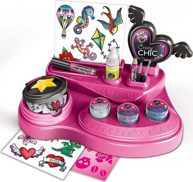 Entdecke die spaßige Welt der Kreativität mit dem Mädchenset für temporäre Tattoos CRAZY CHIC. Dank der reichhaltigen Ausstattung – Klebeschablonen, farbiger Glitzer und Körperfarbe mit Leuchteffekt – kreierst du einen originellen Look für jeden Anlass. Der praktische Arbeitstisch hält alle Utensilien zusammen und erleichtert das Auftragen.