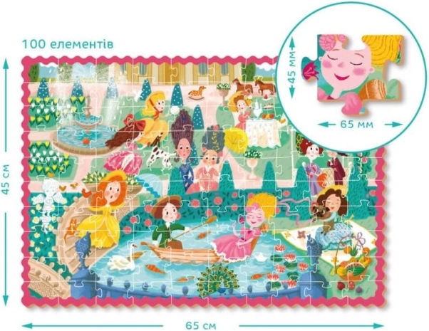 Fröhliches Kinderpuzzle für kleine Märchenfans: 100 Teile mit dem Motiv Prinzessinnen auf der Promenade im Format 65 × 45 cm. Ideal ab 5 Jahren, fördert logisches Denken, Geduld und Feinmotorik. Die praktische Box mit Tragegriff für einfaches Mitnehmen sorgt für Spaß zu Hause und unterwegs.