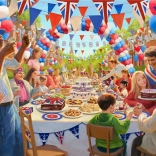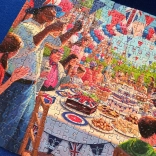 Fröhliche Atmosphäre einer Nachbarschaftsfeier, voller Wimpel und Leckereien. Die vielen Details sorgen für jede Menge Spaß beim Suchen der richtigen Teile.