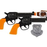 Zwei stylische Revolver mit orangefarbenem Griff und schwarzem Lauf für ein authentisches Western-Erlebnis bei jedem fantasievollen Duell.