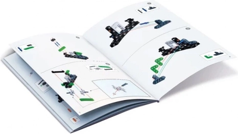 Farbige Handbücher mit klaren Diagrammen und Anleitungen erleichtern den Aufbau und erklären die Prinzipien der Mechanik von Landmaschinen.