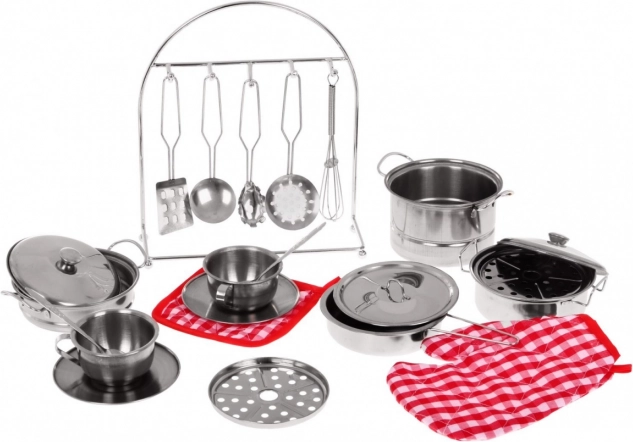 Dieses Set enthält verschiedene Metalltöpfe, Pfannen und Geschirr für ein authentisches Spielerlebnis. Kinder können das Spiel mit realistisch aussehendem Küchenbedarf genießen.