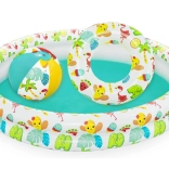 Das Set enthält ein aufblasbares Planschbecken, einen Schwimmring und einen Strandball – alles abgestimmt in einem spielerischen Tropen-Design. Kinder haben sofort alles zur Hand für sichere Wasserspiele.