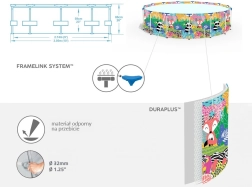 Die robuste Metallkonstruktion mit FrameLink-Technologie gewährleistet hervorragende Stabilität und reduziert Korrosion an Metall-zu-Metall-Verbindungen, damit der Pool mehrere Saisons überdauert.