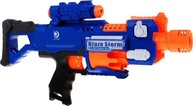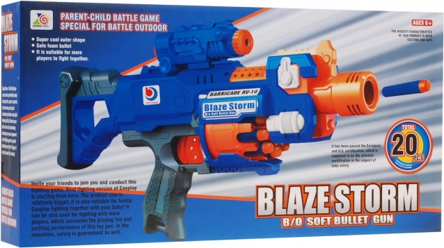 BLAZE STORM ist ein elektrischer Kinderblaster, entwickelt für sicheres und dynamisches Spielen. Dank des vollautomatischen elektrischen Kompressors (Betrieb mit 3× AA, nicht enthalten) ermöglicht er schnelles Schießen ohne manuelles Spannen. Frontladung und ein Trommelmagazin für 10 Geschosse sorgen für flüssige Action, während ein verschiebbares Servicefenster das Entfernen eventuell verklemmter Pfeile erleichtert.