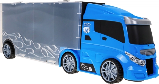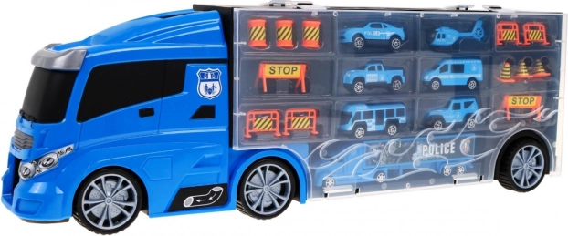 Entdecken Sie den multifunktionalen Polizei-LKW, der sowohl als praktischer Organizer für Spielautos als auch als tolles Spielset dient. An den Seiten befinden sich zwei aufklappbare Stauräume – auf der einen Seite 13 kleinere Fächer, auf der anderen 5 größere. Über der Kabine liegt der Einstieg zur Rutschbahn, die durch die Kabine führt und an der Front des Fahrzeugs endet. Die obere Fläche des LKW dient als „Flughafen“ für den Hubschrauber. Dank des bequemen Tragegriffs können Kinder das Set überallhin mitnehmen.