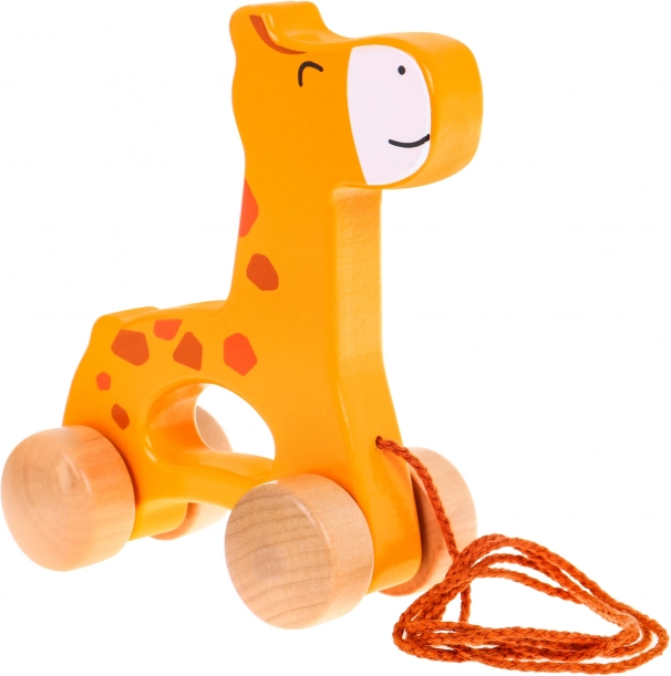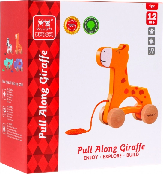 Holzrädchen und eine einfache Schnur ermöglichen es Kindern, die Giraffe problemlos über verschiedene Oberflächen zu ziehen.