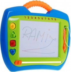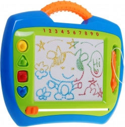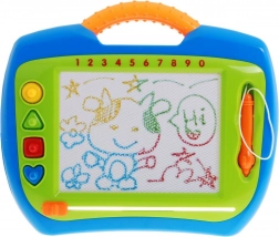 Diese magnetische Maltafel unterstützt Kreativität, Feinmotorik und Konzentration. Die Zeichenfläche hat vier farbige Sektoren (gelb, blau, rot, grün), wodurch Bilder lebendig wirken und Kinder ganz natürlich Farb- und Formerkennung üben. Der Stylus ist an einer Schnur befestigt, damit er nicht verloren geht, und der Schieber unter der Zeichenfläche löscht alles mit einem Zug.