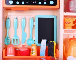 Im Set sind 65 Zubehörteile enthalten: Geschirr, Lebensmittel mit Klett, Kochwerkzeuge, Kreidetafel sowie ein spezieller Eierkocher mit Licht und Sound. Die Küche ist stabil, farbenfroh und in der Größe perfekt auf Kinder ab 3 Jahren abgestimmt.