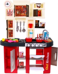 Diese geräumige Kinderküche aus Kunststoff im rot‑schwarzen Design bietet Kindern ab 3 Jahren ein authentisches Kocherlebnis. Reale Lichteffekte und Koch- und Bratgeräusche beim Drehen der Knöpfe fördern kreatives Spiel und die Motorik. Enthalten ist auch ein funktionierender Wasserhahn, der den Spaß auf ein neues Level hebt.