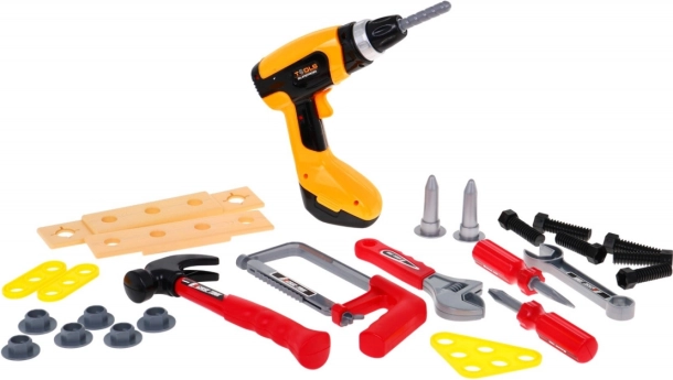 Dieses umfangreiche Werkzeugset bietet Kindern eine sichere und unterhaltsame Möglichkeit, echte Heimwerkeraktivitäten nachzuahmen. Der Star ist die mit 2× AA-Batterien betriebene Akku-Bohrmaschine/Schrauber (nicht enthalten), die beim Anziehen und Lösen realistische Geräusche erzeugt. Zusammen mit Schlüsseln, Hammer, Schraubendrehern, Säge, Schrauben und Verbindungsteilen können Kinder eigene Projekte bauen und die Grundlagen im Umgang mit Werkzeug erlernen.