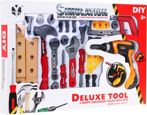 Enthält Schlüssel, Hammer, Säge, 2 Schraubendreher, Schrauben, Dübel, Muttern und Verbindungsteile – alles Nötige für kleine Hausprojekte und zum Üben der Geschicklichkeit.