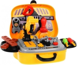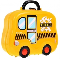 Praktischer Koffer, der Kindern das Verstauen und Transportieren des Werkzeugsets erleichtert. Leicht und einfach zu tragen, im Design eines Schulbusses.