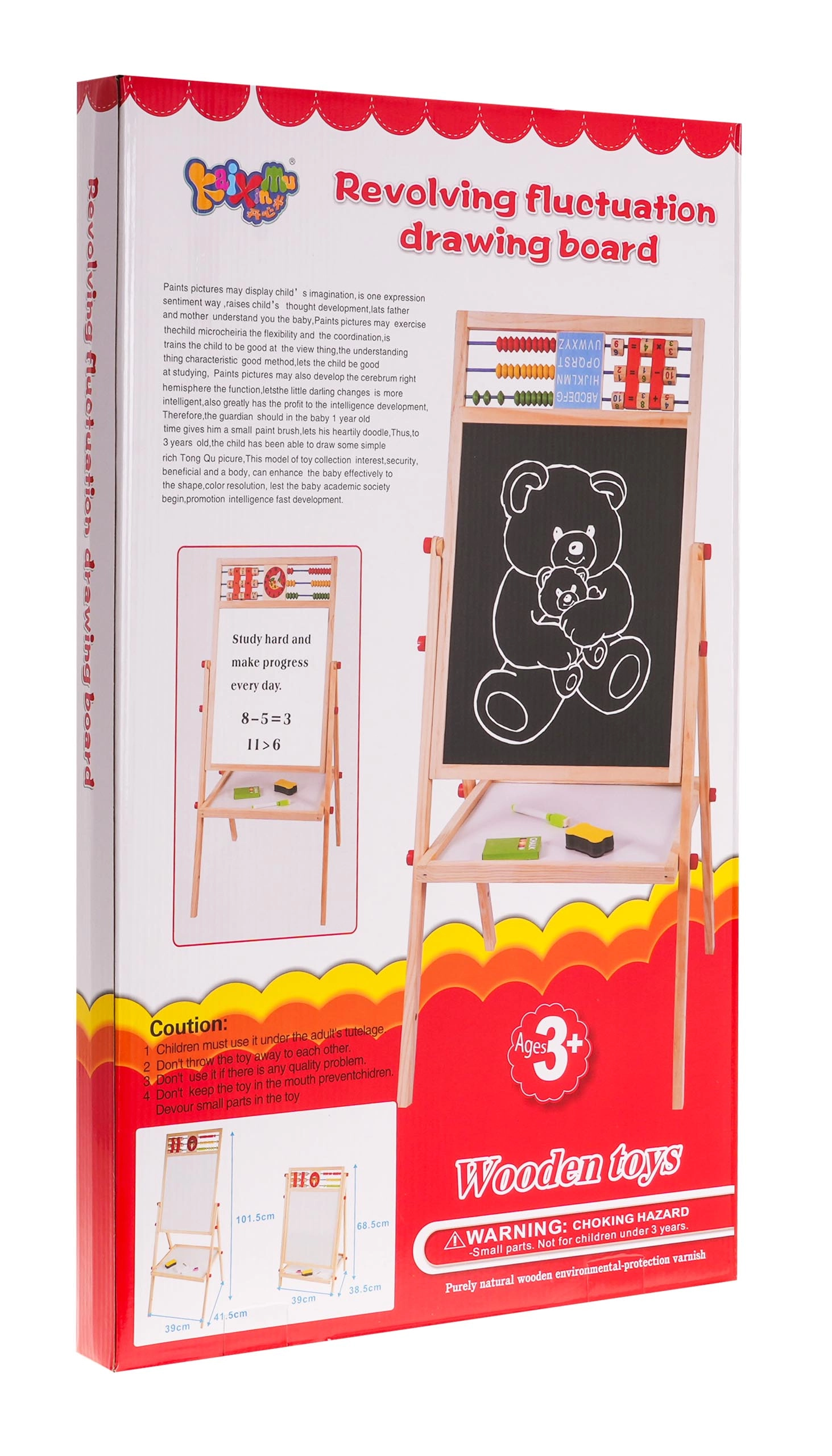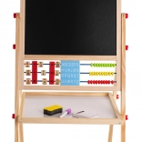 Über der Tafel befinden sich ein Abakus, eine Lernguhr mit Zeigern und dreh- bzw. schiebbare mathematische Elemente für erste Rechenaufgaben. Das untere Ablagefach hält alle Hilfsmittel in Reichweite. Das Spiel mit der Tafel fördert Feinmotorik, Konzentration, vorschulische Kompetenzen und Fantasie.