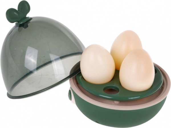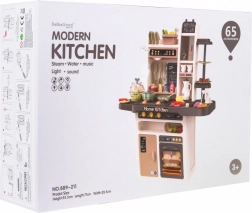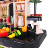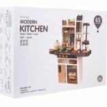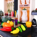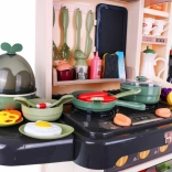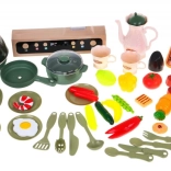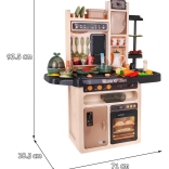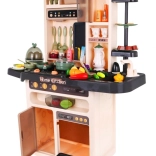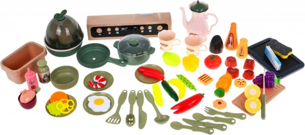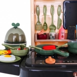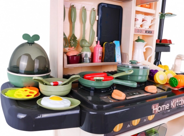 Die Kinderküche kommt mit 65 Zubehörteilen, einschließlich Eiöfen mit Effekten, Töpfen, Pfannen und einer Vielzahl von Plastiklebensmitteln wie Eier und Gemüse.