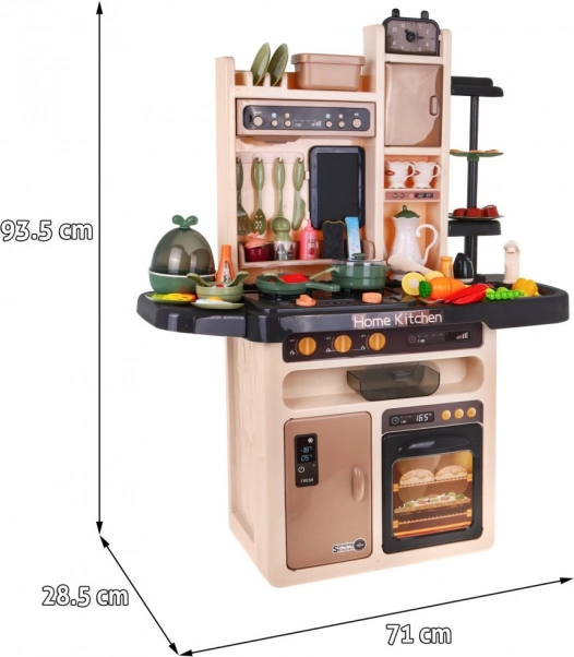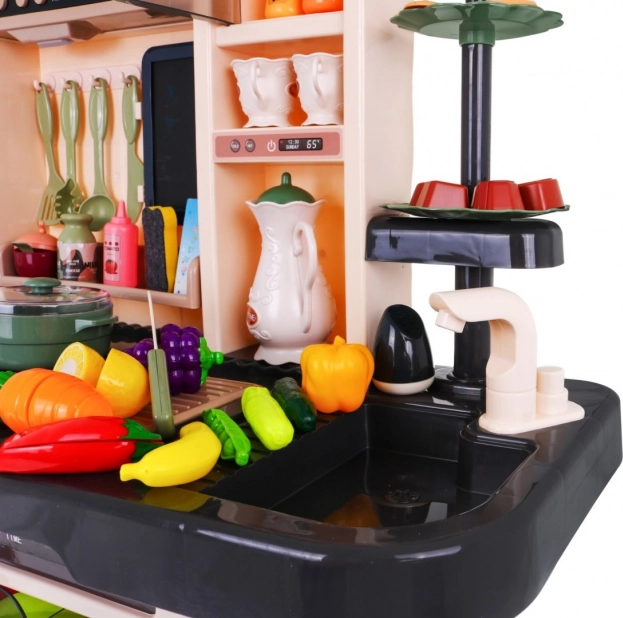 Die Küche ist mit einem realistischen Wasserhahn ausgestattet, der tatsächlich Wasser freigibt, was den Kindern ein authentisches Kocherlebnis bietet.